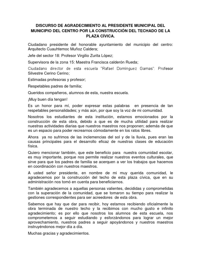 Discurso De Agradecimiento Al Presidente Municipal Del via es.scribd.com
